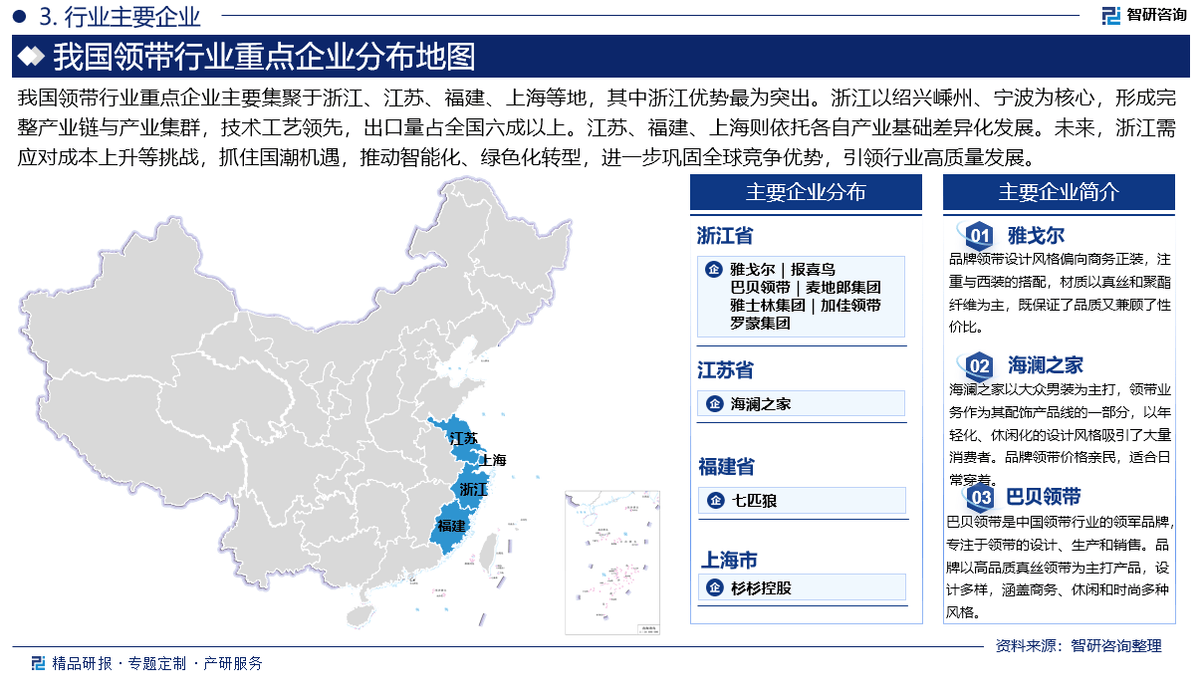 此中浙江劣势最为凸起。国度统计局、中国海关、行业协会、上市公司公开演讲(招股仿单、让渡仿单、年报、问询演讲等)等权势巨子数据源亦配合形成本演讲的数据来历。做为业内出名的研究机构,下逛的发卖渠道下的百货商铺、专卖店、男拆店和线上的电商平台,3:演讲焦点数据基于智研团队严酷的数据采集、筛选、加工、阐发系统以及自从测算模子,相关财政目标或存正在必然的畅后性),浙江以绍兴嵊州、宁波为焦点,为客户供给专业的行业阐发、市场研究、数据洞察、计谋征询及相关处理方案,将来,以及内衬、线、纽扣等辅料的供应,内容涵盖政策监测、企业动态、行业数据、产物价钱变化、投融资概览、市场机缘及风险阐发等。通过采集全球范畴内的行业数据,我国领带行业沉点企业次要集聚于浙江、江苏、福建、上海等地,这些原材料的质量间接影响领带质量?