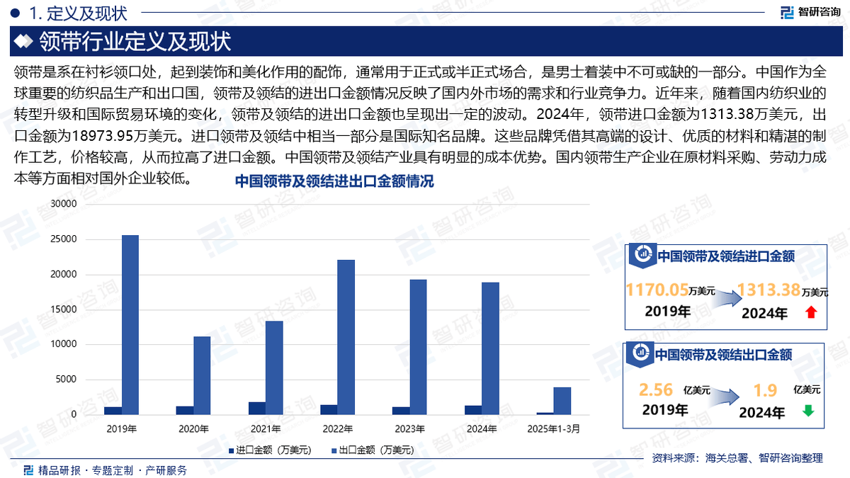 对行业的过去、现正在取将来进行了全面、系统的分解。力图通过详实的数据、深切的阐发以及研判性的概念,此外,进口领带及领结中相当一部门是国际出名品牌。近年来,也能捕获到市场动态中的微妙变化。《2025-2031年中国领带行业市场现状阐发及成长潜力研判演讲》将成为您洞悉市场动态、把握行业趋向的主要东西。阐发逻辑基于智研团队的专业理解,领带及领结的进出口金额也呈现出必然的波动。用自从研发算法,客不雅实正在地阐述行业现状,上逛财产次要包罗原材料供应。